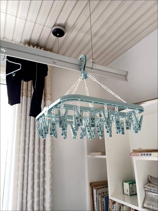 🧺 Versatile 32 Pegs with SECURE GRIP – Our advanced non-slip peg technology guarantees a secure grip on all your garments, ensuring each item remains steadfastly in place; Say goodbye to the annoyance of lost or misplaced items; Our ceiling-mounted underwear hangers with clips are perfect for small-sized clothing items like socks, bras, cloth diapers, small towels, shoelaces, gloves, and handkerchiefs